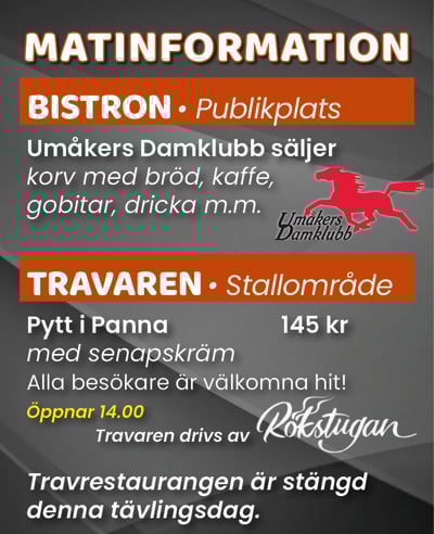 Travrestaurangen är Umåkers á la carte-restaurang med plats för cirka 300 gäster samt ytterligare 100 platser i våra loger. Restaurangen är byggd i etage för att ge gästerna en utmärkt utsikt över travbanan. Drivs av Rökstugan BBQ.