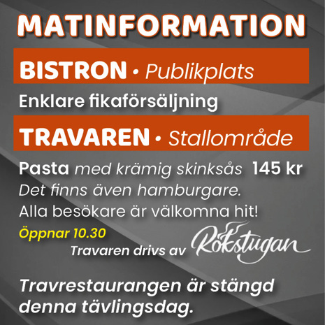 På stallbacken ligger Restaurang Travaren som serverar hemlagad mat varje tävlingsdag. Drivs av Rökstugan BBQ.