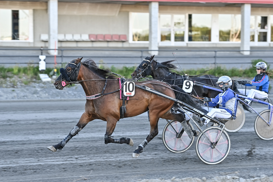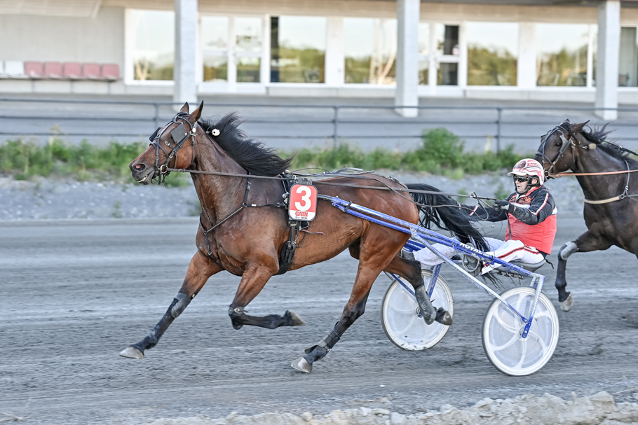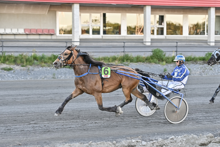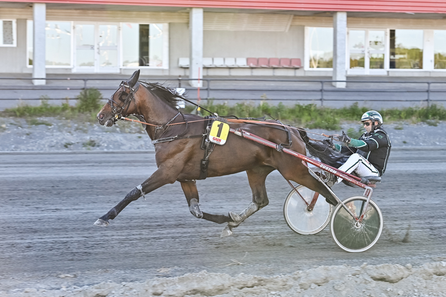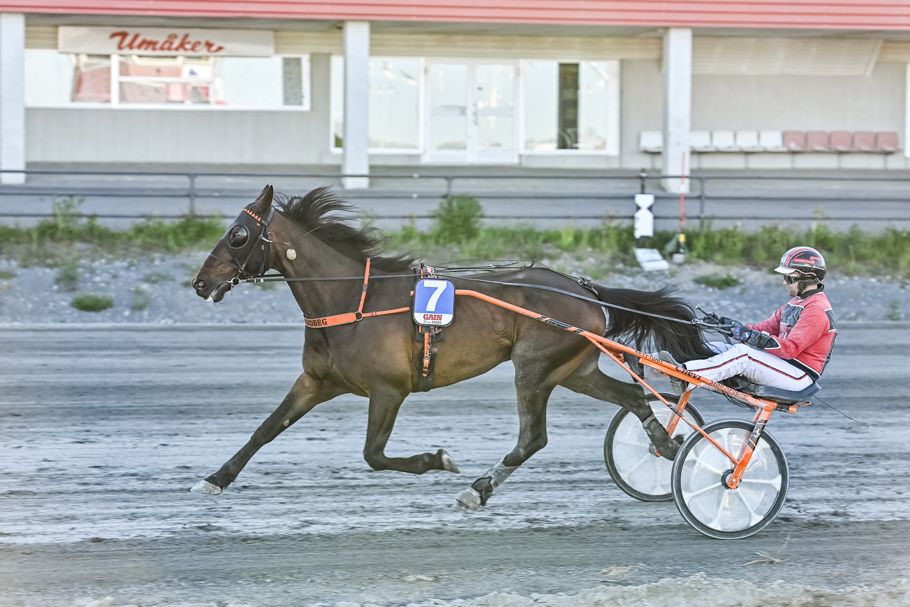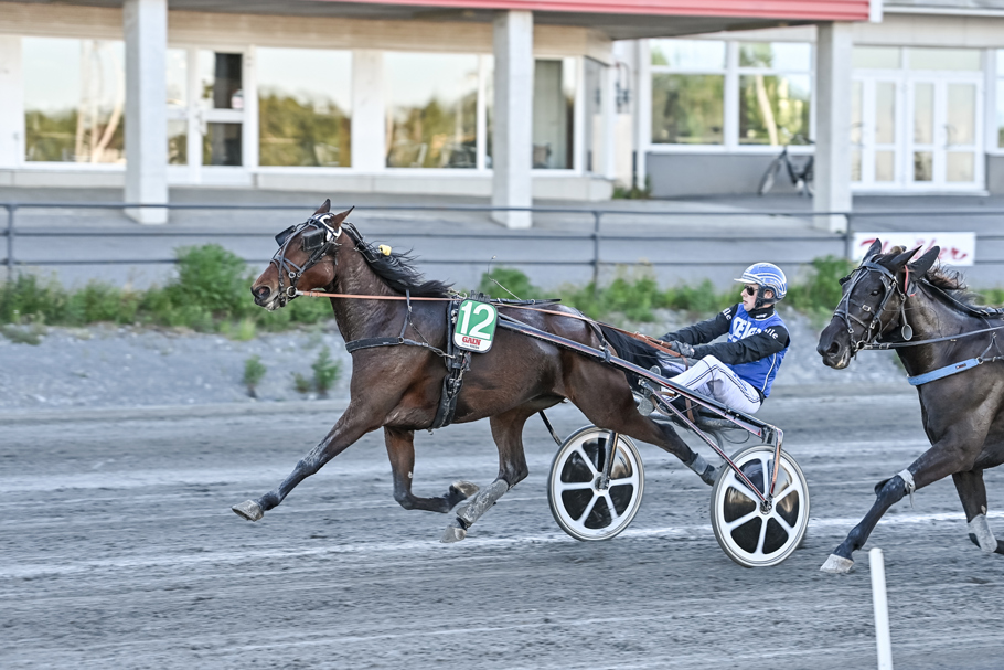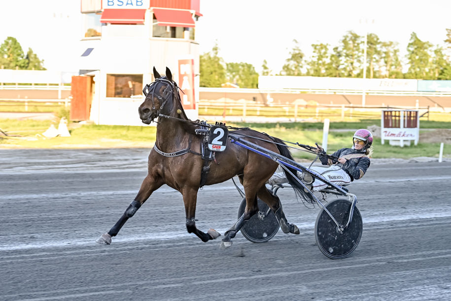 Lotus Atom (Mikael Lindqvist) följde med som fjärde-femte häst. Han levererade en snabb sista långsida och övertog ledningen 500 kvar. Gick undan till säker seger. Husnäs Tilja inledde som tredje häst och tog sig fram utvändigt ledaren. Pressade och tog över ledningen 600 kvar, men kunde inte stå emot vinnaren när de kom. Kom tillbaka igen på upploppet till andraplatsen. Farm Glittra galopperade dubbelt, men kom tillbaka med en snabb avslutning till tredjeplatsen.
