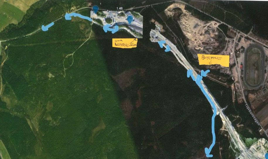 Från måndag morgon 21/9 blir det en ny dragning för träningsvägen vid vägprojektet. (se bilden) Det är öppet för överfart uppe vid Klabböle, men den temporära vägen förbi brobygget stängs. Gamla rakbanan kommer att kunna användas från och med måndag morgon. Notera också vart den nya överfarten till slingan är någonstans och hur den sträckningen är. En viss byggtrafik kan förekomma på Lidbergsvägen men dom ska visa hänsyn för hästarna.