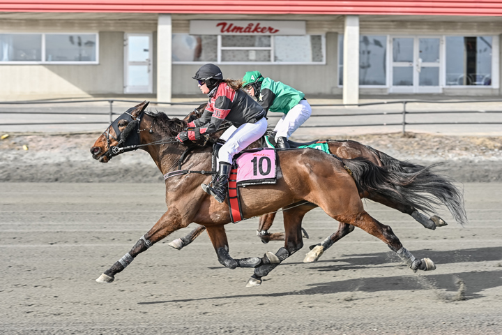 Just in Time L.A. (Maria Bodin) kom fram i andraspår till andra utvändigt och var senare först i andraspår. Tog över ledningen 650 kvar och hade en god ledning på upploppet, men den krympte rejält sista biten. Höll undan till segern. Ten C.C.Face reds invändigt inledningsvis. Var med som tredje häst i slutsvängen och avslutade snabbast på upploppet, men hann inte fram till vinnaren. Bamse Å. inleddet utvändigt ledaren, men reds till ledningen. Fick släppa till vinnaren på bortre långsidan och var med som andra häst i slutsvängen. Höll bra till tredjeplatsen.