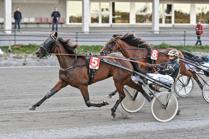 Xanthis Excalibur (Stefan Johansson) satt i tredje-fjärde och slutligen i femte utvändigt, innan attacken i tredjespår kom knappa varvet från mål. Fick ut en rygg, men laddade om för en ny attack och levererade ett snabbt sista halvvarv. Greppet kopplades i början av upploppet till en säker seger. Rejäl insats! Estelle Ima låg i rygg på vinnaren större delen av loppet. Försökte utmana på upploppet, men fick inget grepp på vinnaren. Simb Zacky kom fram bra i starten och hittade ledarryggen. Tog sig ut i andraspår 500 kvar och var nära att få fritt, men blev kvar. Avslutade sedan bra invändigt mellan hästar till tredjeplatsen.