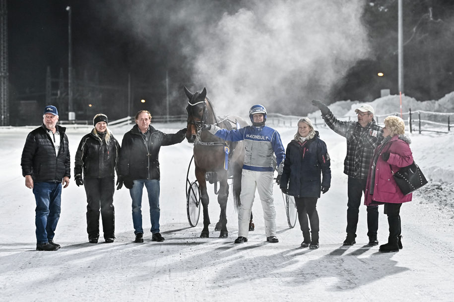 Twinquit (Micael Melander/Tiina Koskinen) kördes offensivt och kom via tredjespår genom första sväng för att ta ledningen när de passerade halvvarvet på 1.16,7. De fortsatte i bra tempo och nådde varvet på 1.15,9. Tempot fortsatte vara högt och de segrade säkert på 1.14,8. Jimpeto Joy galopperade när bilen släppte, ställde sig och tappade inte så mycket position. Fick till slut tredje utvändigt. Gick på i tredjespår 600 kvar. Lite trög, men fick fart i slutsvängen och avslutade bra till andraplatsen. Klammer var snabbt ut och tog hand om ledningen. Släppte till vinnaren när de nådde halvvarvet. Hann fram invändigt till tredjeplatsen.