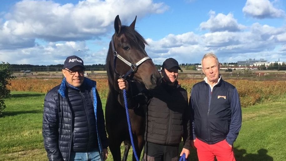 Om en månad drar Samu Sundqvist igång sin tränarrörelse här på Umåker. Han har redan klart med sin första häst som ska in på träningslistan. Det är 4-årige M.T.Powertool om i lördags segrade på banrekordet 1.12,0 på Bollnästravet. Här poserar hästen och Samu med två av delägarna i Stall Umåker Friends, Jan R Larsson och Anders Nilsson.