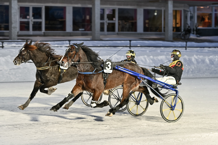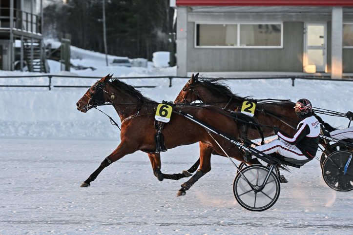 West Wind (Robert Dunder) fick backas från start och hamnade i något som blev tredje utvändigt, en bit ner i fältet. Attacken kom 700 kvar via tredjespår. Tog sig fram utvändigt ledaren i slutsvängen och kunde koppla greppet 100 kvar. Höll undan på bra sätt till andra raka.