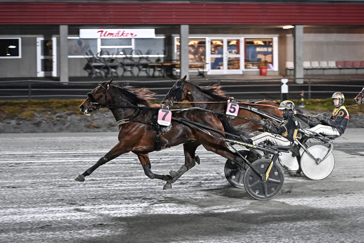 Jessica Brodda (Mats E Djuse/Stefan Johansson) kördes direkt till spets, men släppte för att få ett lopp i rygg på ledaren efter ett halvvarv. Gick ut som första häst i andraspår med 650 kvar. Kopplade greppet direkt när de svängt in på upploppet och gick undan till andra raka segern på Umåker. Obesegrad i nya regin.
