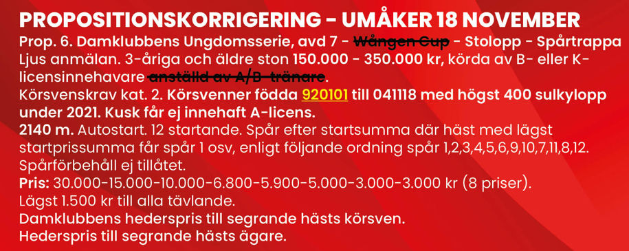 Vi har i samråd med Svensk Travsport gjort en propositionskorrigering till 18 november i Damklubbens Ungdomsserie.