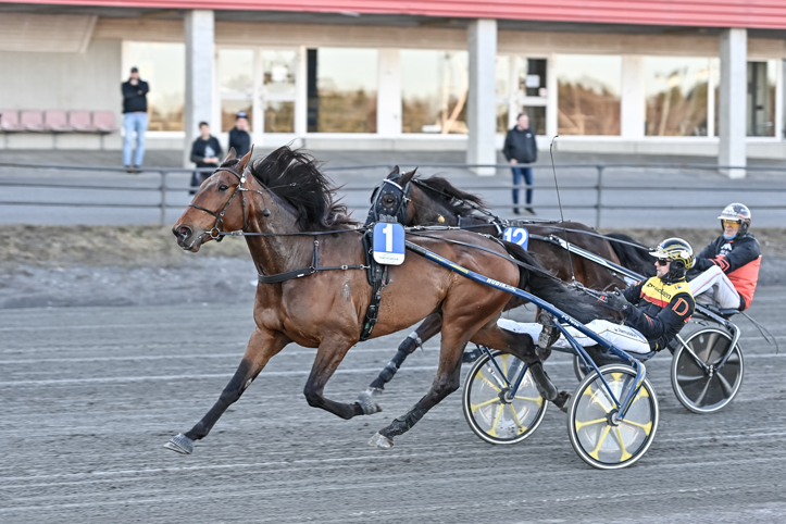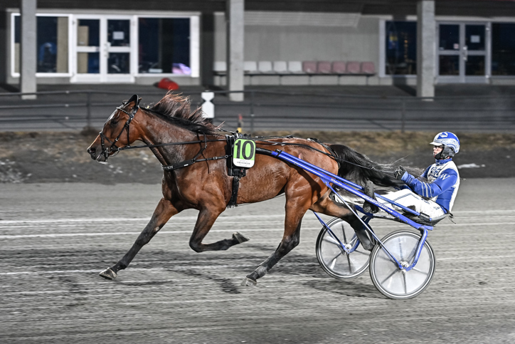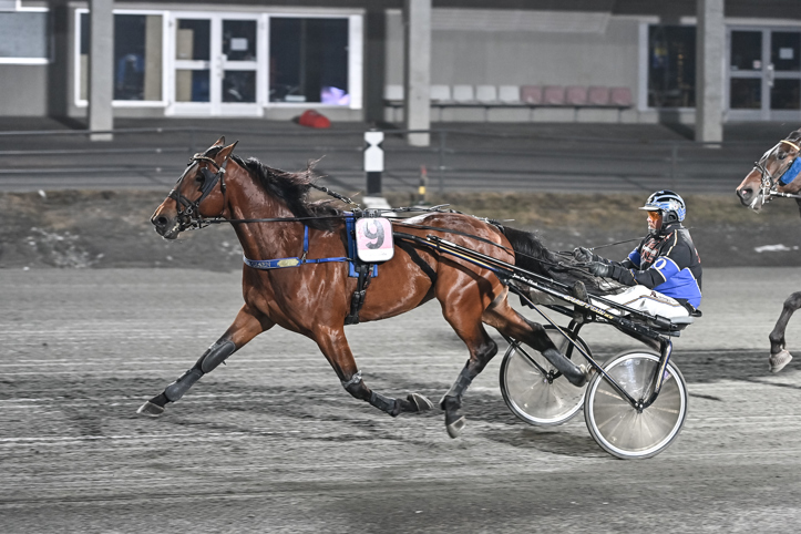 Kalmar (Henrik Svensson) kördes invändigt från sitt tillägg fram till tredje invändigt. Ut i andraspår efter ett halvvarv. Fortsatte fram mot ledningen med knappa 1500 kvar. Fick öppna varvet på 1.27,3. Kunde sedan gå ifrån till en säker seger på upploppet. Mycket bra!