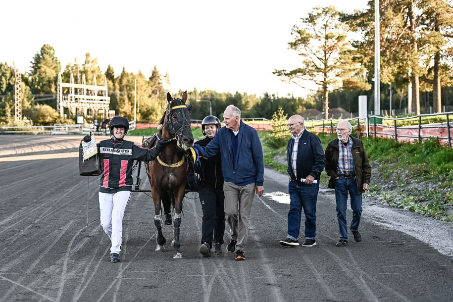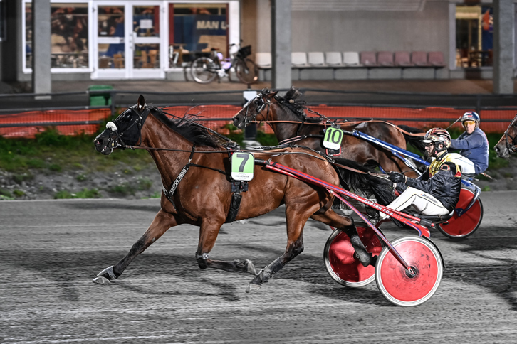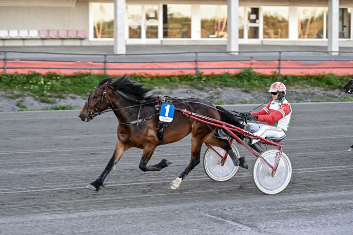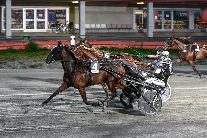 Gift From Love (Linn Andersson/Sören Lennartson) hamnade nere i kön från sitt bakspår, vilket sedan blev fjärde utvändigt. Gick med i tredjespår på sista långsidan och vreds ut i egen attack i slutsvängen. Avgjorde lätt på upploppet.