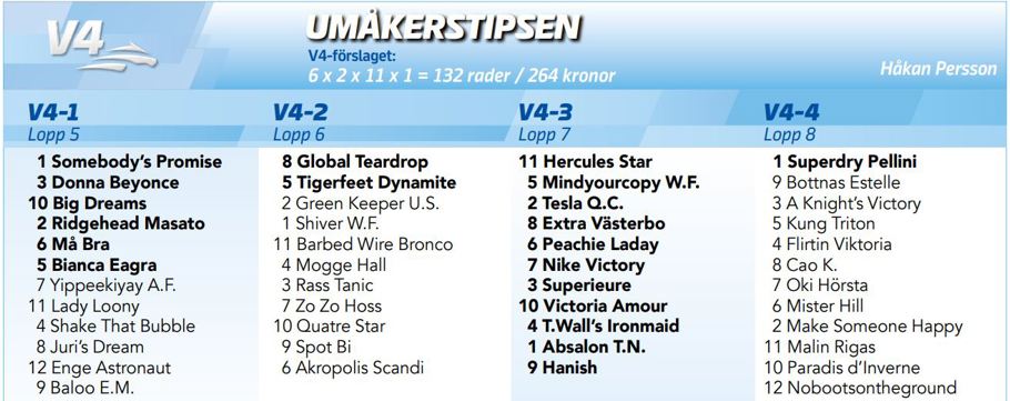 I V4-avslutningen får innerspårets Superdry Pellini tipset som spikförslag. Hon hade två diskningar inför segern senast i ett P21-lopp på Dannero. Om hon håller sig på benen, bör det vara en god chans här med välkörande William Strand. Hon visade i alla fall bra form senast när hon vann från ledningen efter en rask avslutning.