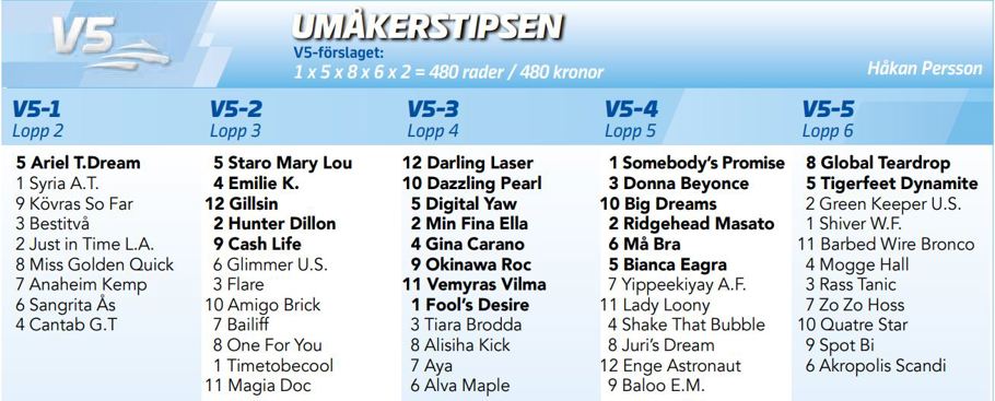 Dagens bästa spik kommer direkt i V5-inledningen och det är montédrottningarna, Ariel T.Dream med Caroline Forsner. Hon var jättefin när hon nästsenast segrade i Just Indeeds montélopp nere på Hagmyren mot bra motstånd. Senast var hon ute i helgen på Axevalla i Monté-StoChampionatet som vanns av Galactia på nytt svenskt rekord. Där var Ariel på en hedrande femteplats. Kapable och montédebuterande Kövras So Far är ett oskrivet kort i monté.