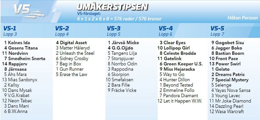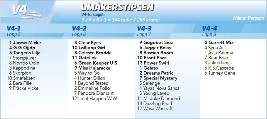 Plussade på med en häst på V4-kupongen som inte fick plats på V5:an, Tangens Lilja. Stoet gillar längre distanser och är i grunden klart bättre än raden. Hon gillar Umåker, vi minns väl när hon segrade i Norrländska Elitstoet förra året.