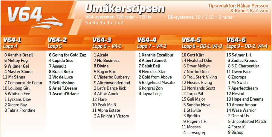 Lite av en chansspik i en öppen V64-omgång och kanske hade han även kunnat passa under ”skrällrubriken”. Intrycket senast var riktigt bra när han satt fast med mycket sparat på Rättvik där Mo Sjur segrade. Han står bra inne i loppet och hittar Mats E Djuse ut i andraspår ska det vara en bra chans.