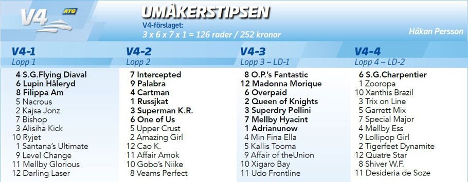 Palabra borde inte bli så hårt betrodd? Stoet har förvisso minst pengar i loppet, men är lite av jämnheten själv. Hon har bara missat prisplaceringen i en av 18 starter och den gången blev det galopp. Hon har visat uppåtform på slutet och rekordsänkt i de två senaste starterna. Härifrån blir det svårt att utnyttja startsnabbheten, men får hon ett passande lopp...se upp!