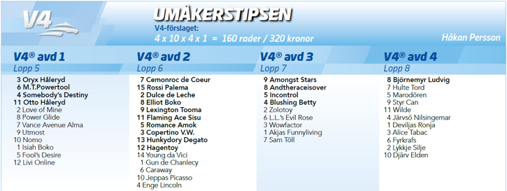 Dulche de Leche gör årets 29:e start när han går ut i ”Varma kannan”. Han startas gärna i stayerlopp och det är knappast någon häst i Sverige som tävlat fler meter än honom i år. Senast han startade på Umåker var i Prix Umåker där han var tvåa bakom Spickleback Face. Här står han på kronan precis på rätt sida tilläggsgränsen och han har tjänat ihop till en seger snart.