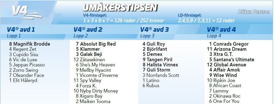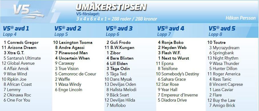 Oklart hur mycket betrodd B.W.Kungen kommer att bli, men han får ändå rubriken V5-skrällen. Han gör comeback efter frånvaro sedan första oktober och startar från bakspår. Raden är inte så bländande, men hästen har ett gott kunnande och tävlade ifjol i lite hårdare sammanhang. Då segrade han i tre av nio starter. Det är också intressant att det är första gången som Ove A Lindqvist kör hästen.