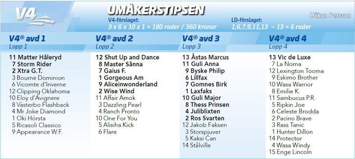 Vic de Luxe har nu fått ett antal lopp i kroppen efter lång frånvaro och formen ser ut att vara i stigande. Sprinterlopp kanske inte är någon fördel, men han har ändå V75-segrat (Winter Trot Classic 2017) på distansen. Här står han bra inne i loppet och värsta motbudet är nog en felfri La Norna från ledningen.