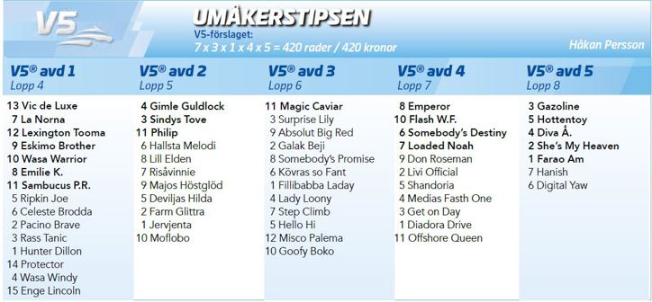 Gaius F. har levererat relativt jämna prestationer på slutet och är den från framspår som rankas högst. Springspåret kan både vara en risk och en möjlighet, beroende på hur bra han kommer iväg därutifrån. Avslutningen till tredjeplatsen senast här på Umåker var i alla fall en formindikator och han står perfekt inne på pengar.