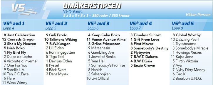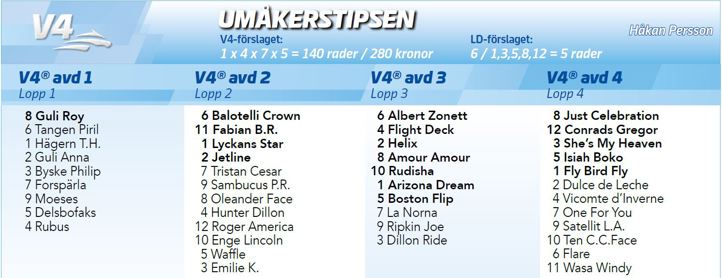 Guli Roy kommer med två raka. Senast segrade han här på Umåker, efter att Mats E Djuse kört till ledningen. Då vann han enkelt. Den här uppgiften känns tilltalande och det borde vara bra chans till tredje raka. Notera att 6 Tangen Piril står 20m bättre till mot Guli Roy denna gång.