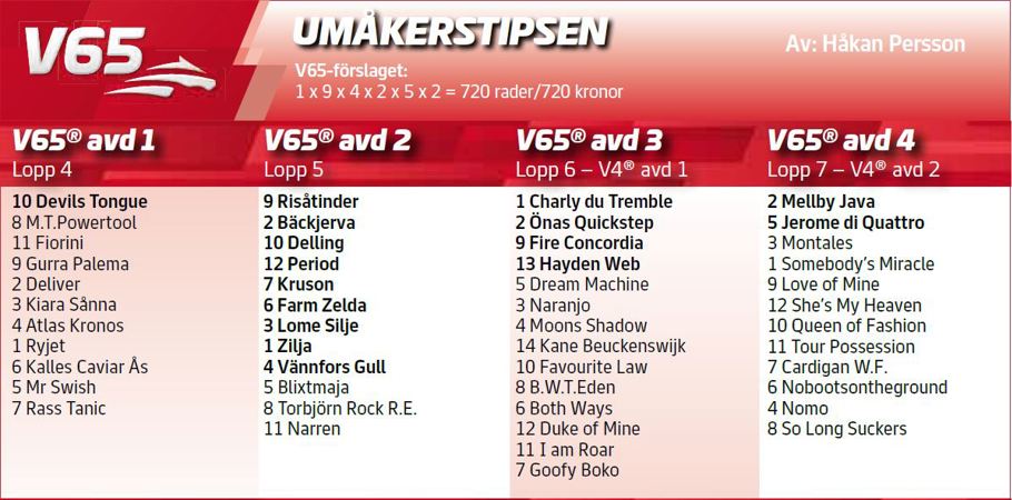 Devils Tounge hade en jättefin treåringssäsong förra året. Han gjorde årsdebut senast här på Umåker. Fick då ett lopp i andra utvändigt och gick på i tredjespår halvvarvet kvar. Tog sig fram utvändigt ledaren, men kunde inte stå emot på upploppet. Nu har han fått lopp i kroppen och bör vara förbättrad till denna start. Står bättre inne i loppet, än senast.