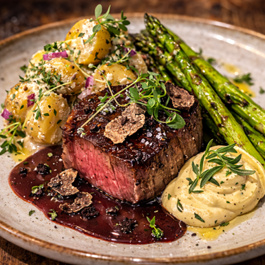 Oxfilé tryffelrödvinsås, ljummen potatissallad, säsongssparris & dragonmajonäs ”bea”.