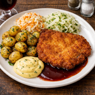 Varmrätt: Schnitzel med örtrostad kulpotatis,